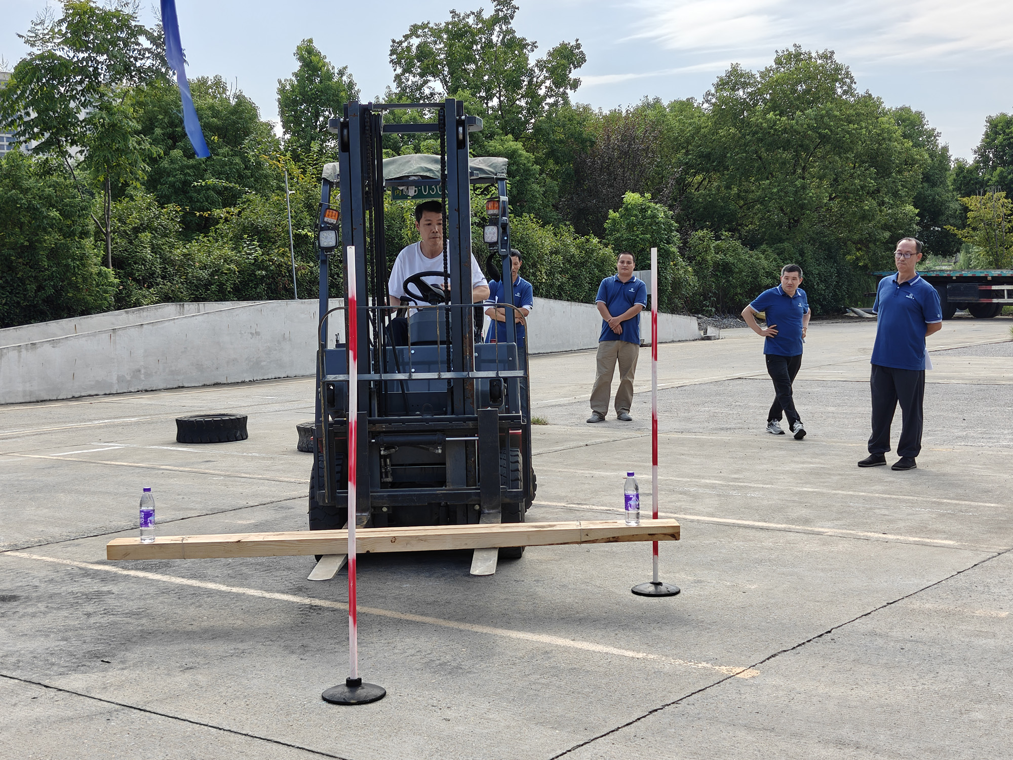 叉車技能比武側(cè)重于選手的操控熟練性與心理素質(zhì)。項(xiàng)目設(shè)置緊密貼合實(shí)際作業(yè)場(chǎng)景,要求選手在限定時(shí)間內(nèi)完成轉(zhuǎn)向往返、托盤精準(zhǔn)移庫碼放等動(dòng)作,并在繞障礙物操作過程中確保托盤上礦泉水瓶保持穩(wěn)定,不得掉落。競(jìng)賽不僅要求速度,更注重操作的平穩(wěn)性與準(zhǔn)確性,充分體現(xiàn)出高標(biāo)準(zhǔn)的作業(yè)要求。