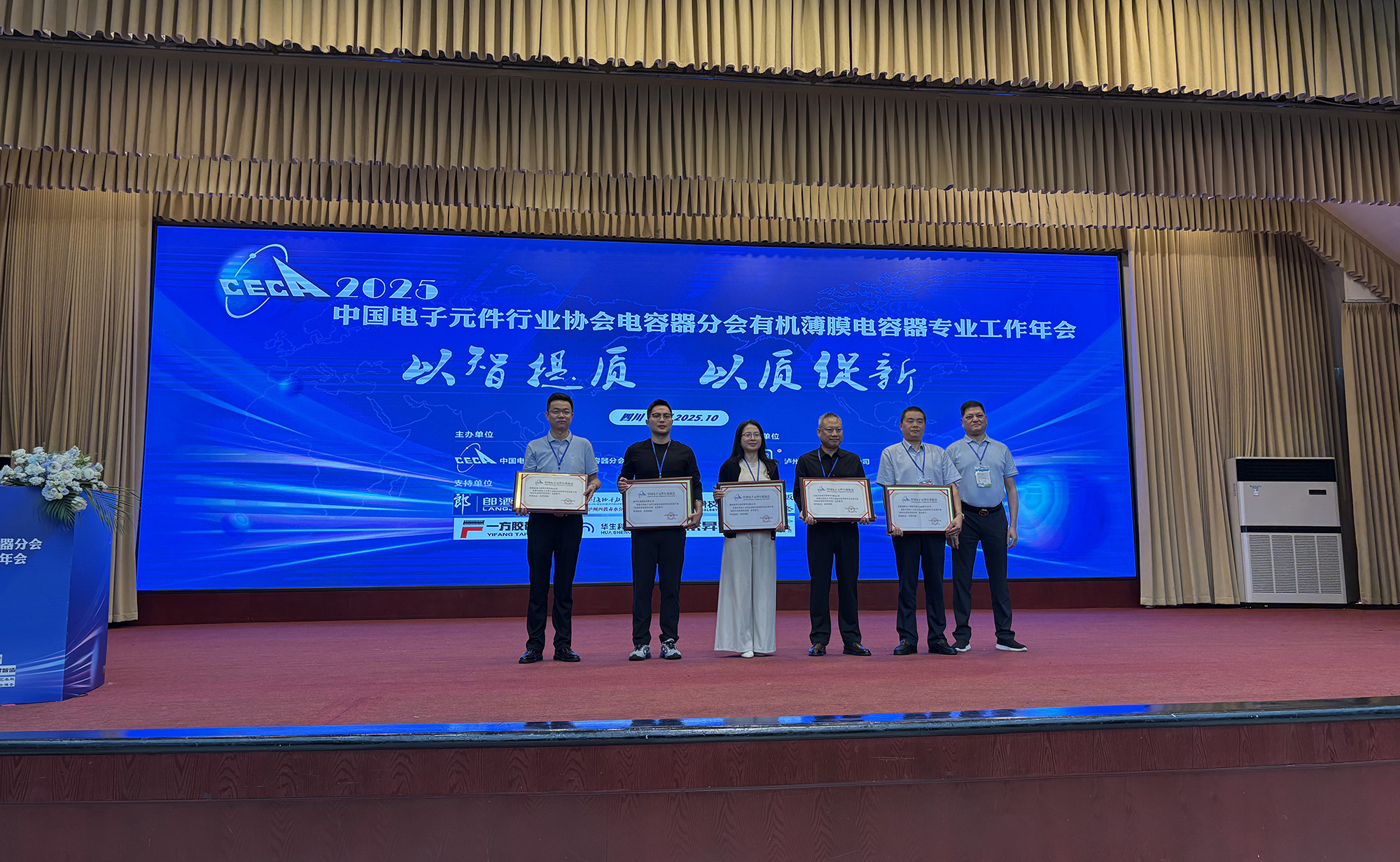 10月14日至17日,中國(guó)電子元件行業(yè)協(xié)會(huì)電容器分會(huì)有機(jī)專業(yè)2025年工作年會(huì)在四川瀘州成功舉辦。中電元協(xié)常務(wù)理事、電容器分會(huì)第九屆副理事長(zhǎng)、公司總經(jīng)理鮑俊華代表公司出席并作主題交流報(bào)告。薄膜分公司獲評(píng)電容器分會(huì)2025年度“優(yōu)秀供應(yīng)商”榮譽(yù)稱號(hào)。